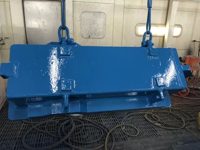 首批次無溶劑涂料在振華南通傳動(dòng)公司的齒輪箱上進(jìn)行了施工試點(diǎn),施工參數(shù)設(shè)定為底漆80μm,中漆150μm,面漆80μm,在不改變生產(chǎn)線現(xiàn)有單組份泵設(shè)備參數(shù)的情況下,順利的完成了三道涂料的施工。涂料施工混合壽命超過2小時(shí)。同時(shí),以其無刺激性涂料施工味道的優(yōu)勢(shì)獲得了施工工人的好評(píng)和認(rèn)可。整體重防腐涂層體系已經(jīng)通過實(shí)驗(yàn)室1500小時(shí)以上鹽霧測(cè)試和150天以上的耐化學(xué)品測(cè)試,整體性能優(yōu)異。